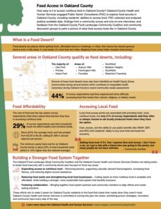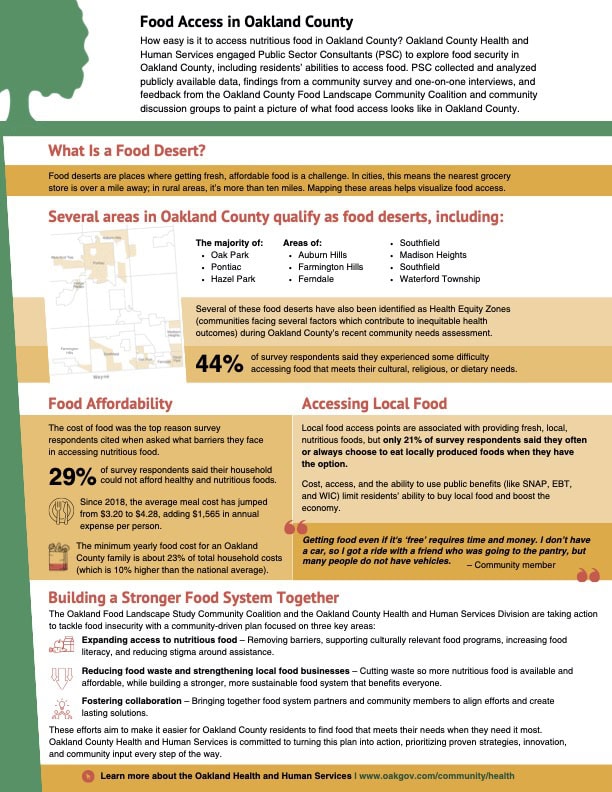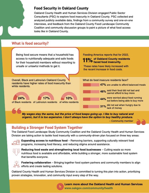 After establishing a baseline for food needs and services in Oakland County, PSC shared the collected data with coalition and community members to inform their recommendations for a plan forward. The county’s goals and objectives to improving food access and strengthening both the food system and community are below: